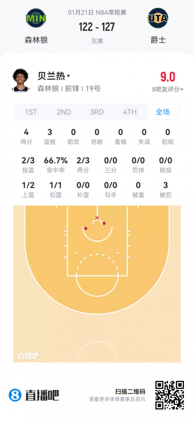 森林狼首轮17号秀贝兰热 登场5.1分钟